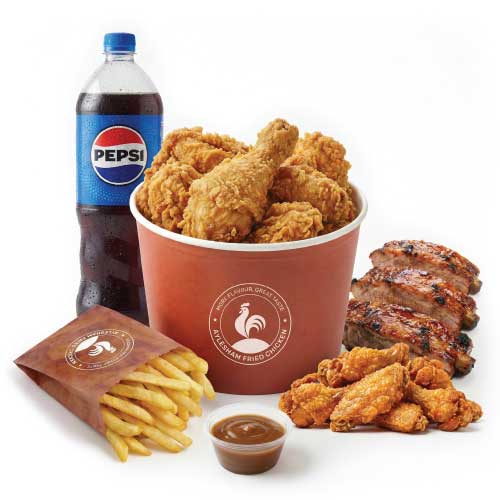 “Perfect for sharing! Enjoy our ultimate family combo with 10 crispy fried chicken pieces, 6 spicy hot wings, 6 smoky BBQ ribs, 4 regular fries, any 2 large sides of your choice, and a refreshing 1.5L drink – all in one unbeatable feast!”