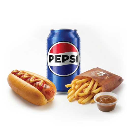 A perfect bite! Juicy Hot Dog served with crispy Fries and a refreshing Drink or tasty Side.